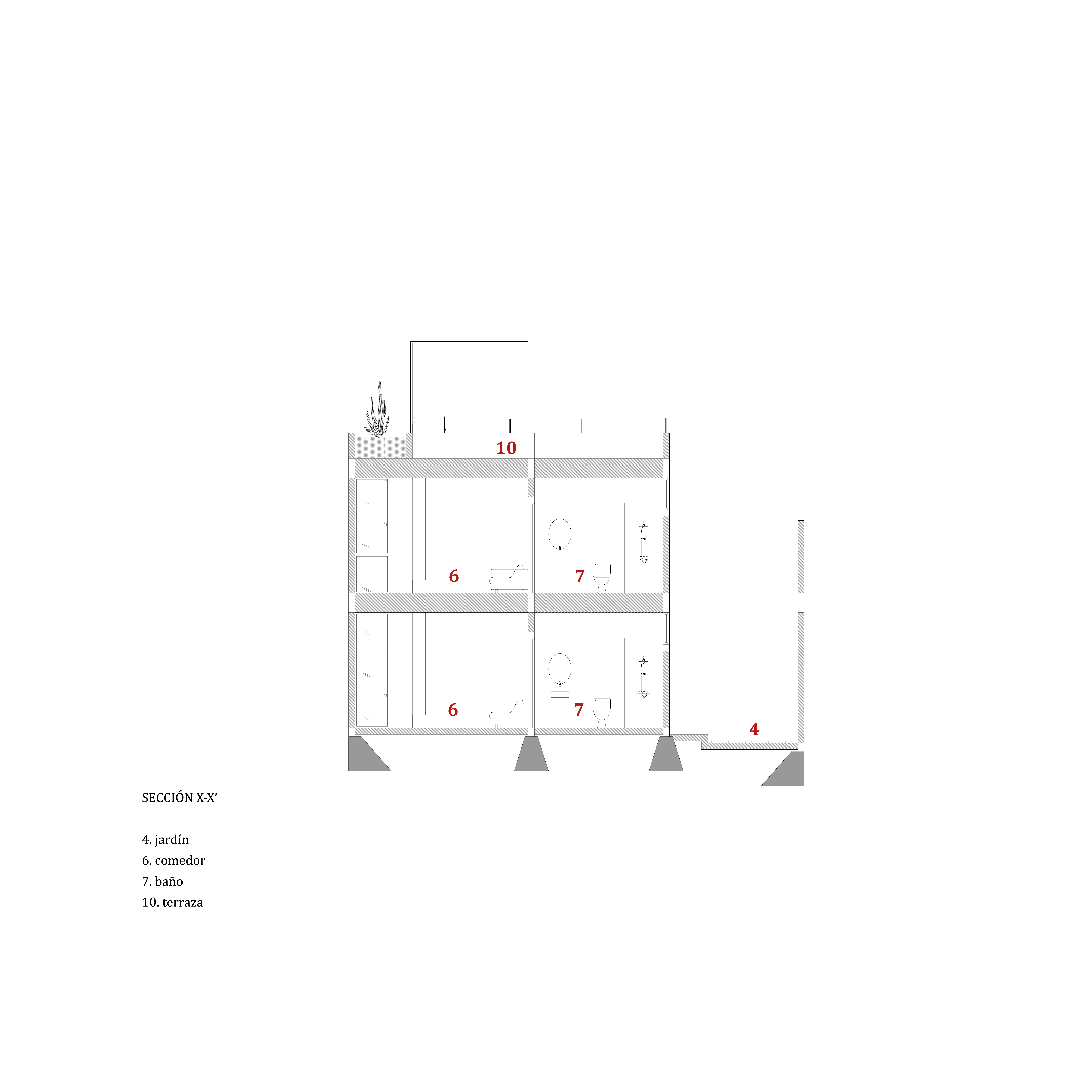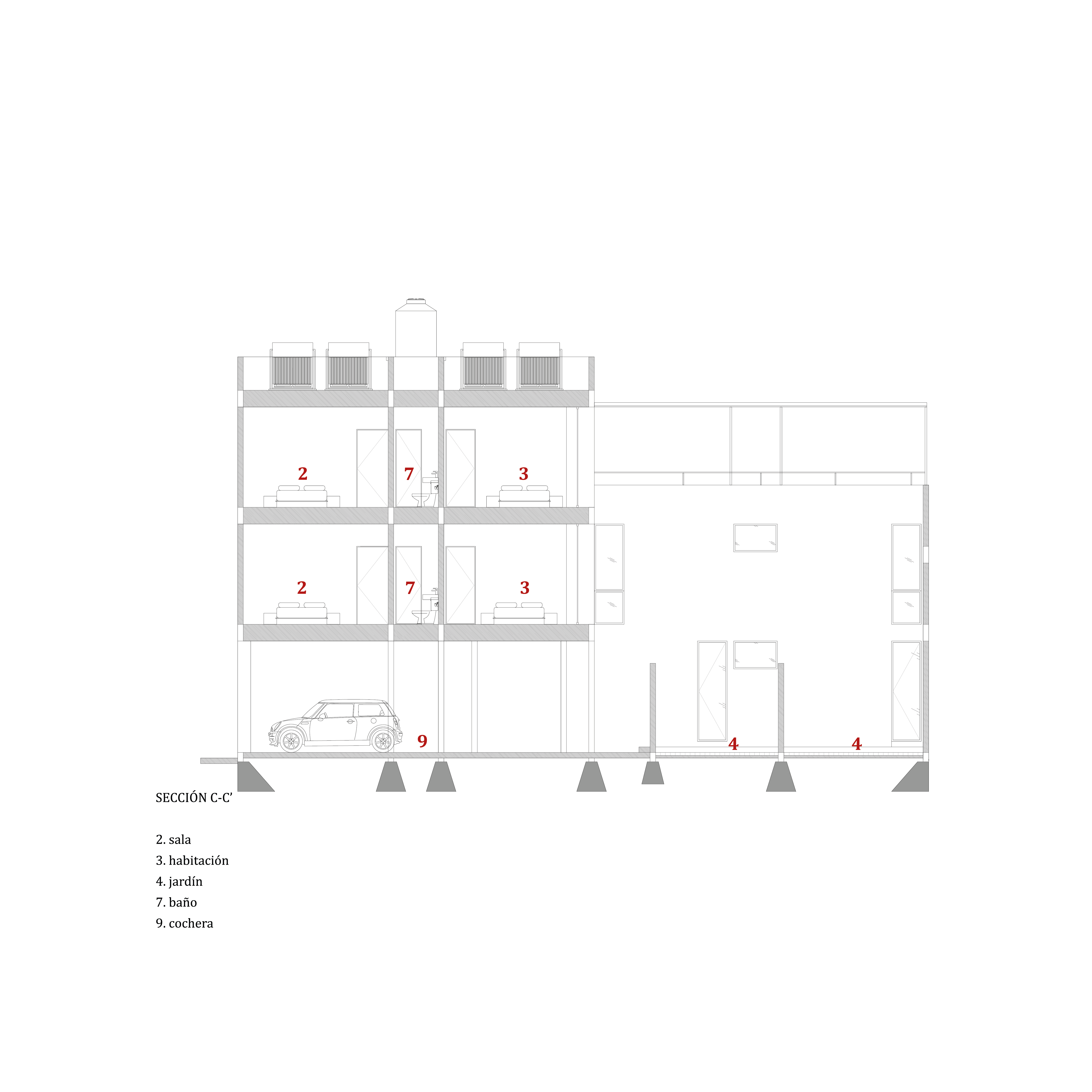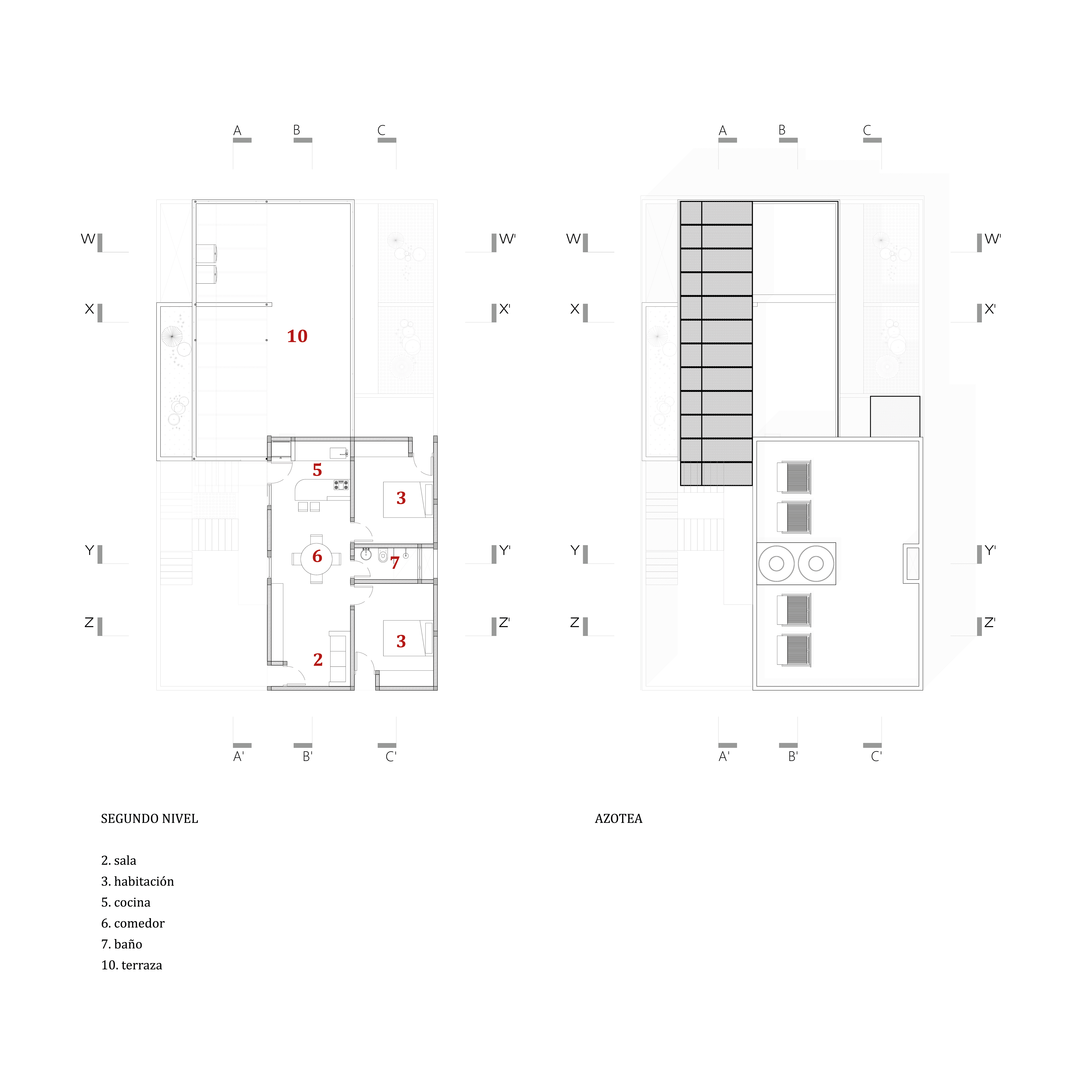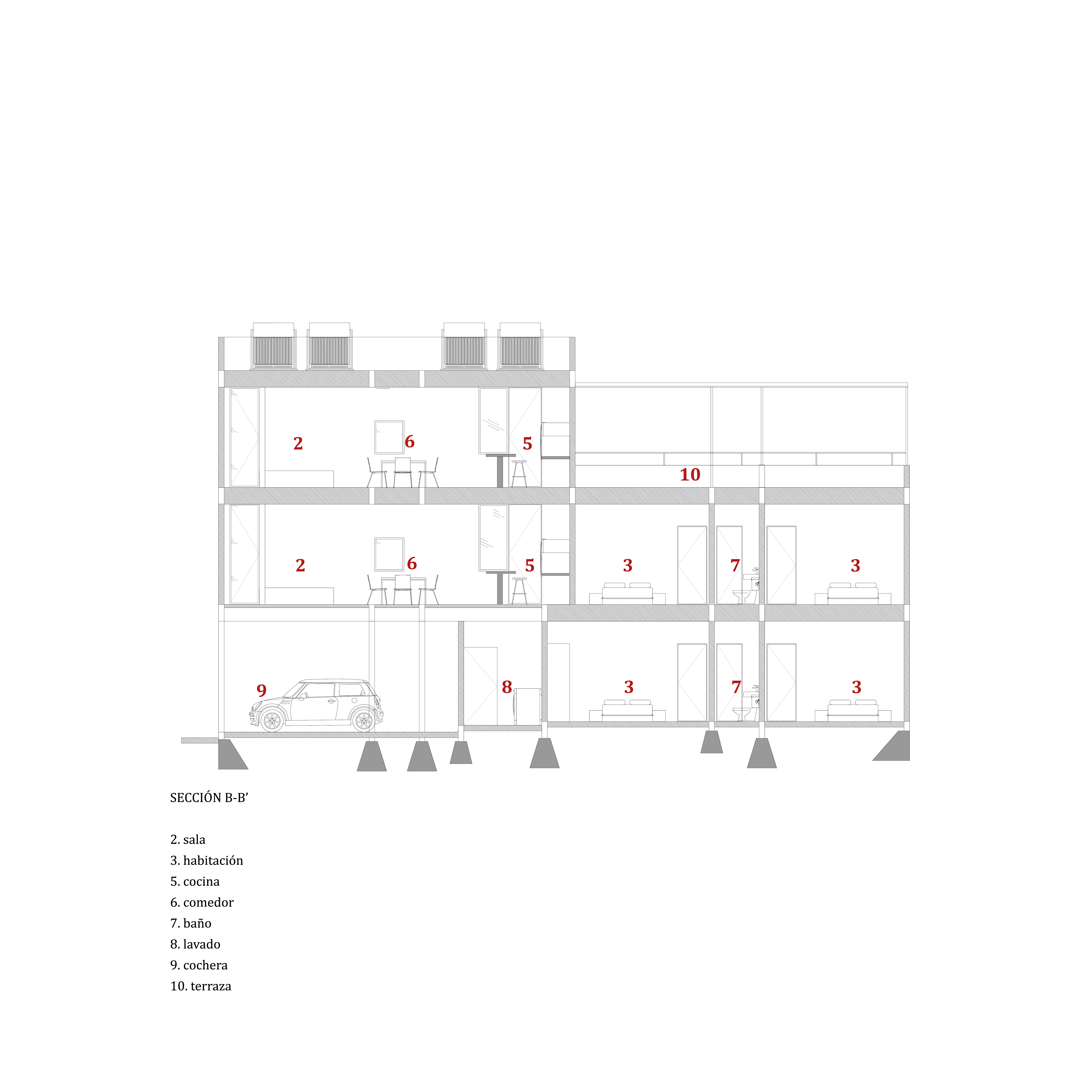 Similar en programa al nivel inferior, pero con el valor agregado de contar con una terraza privada y un patio de lavado y secado, concebido como un espacio compartido para uso flexible entre los habitantes del conjunto.