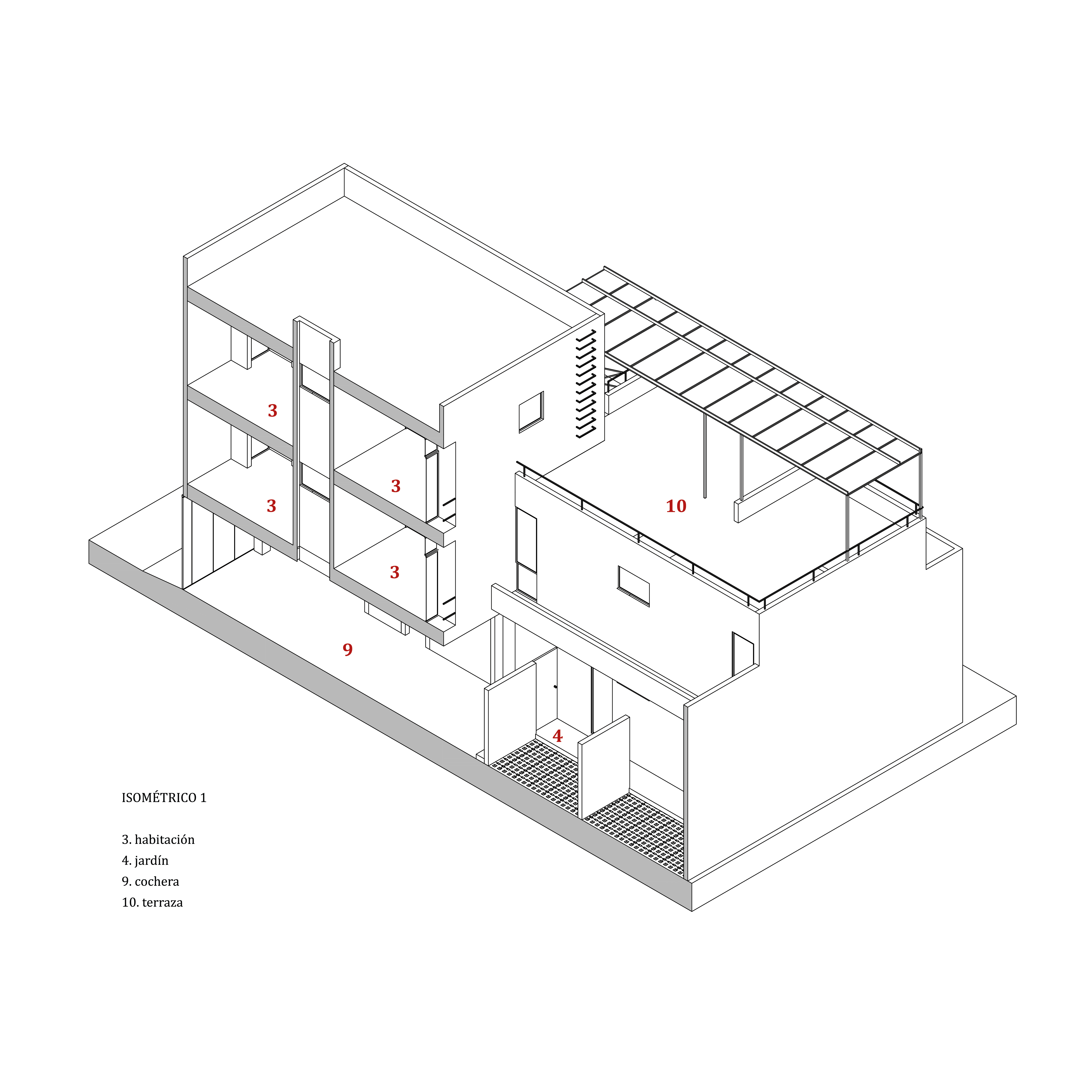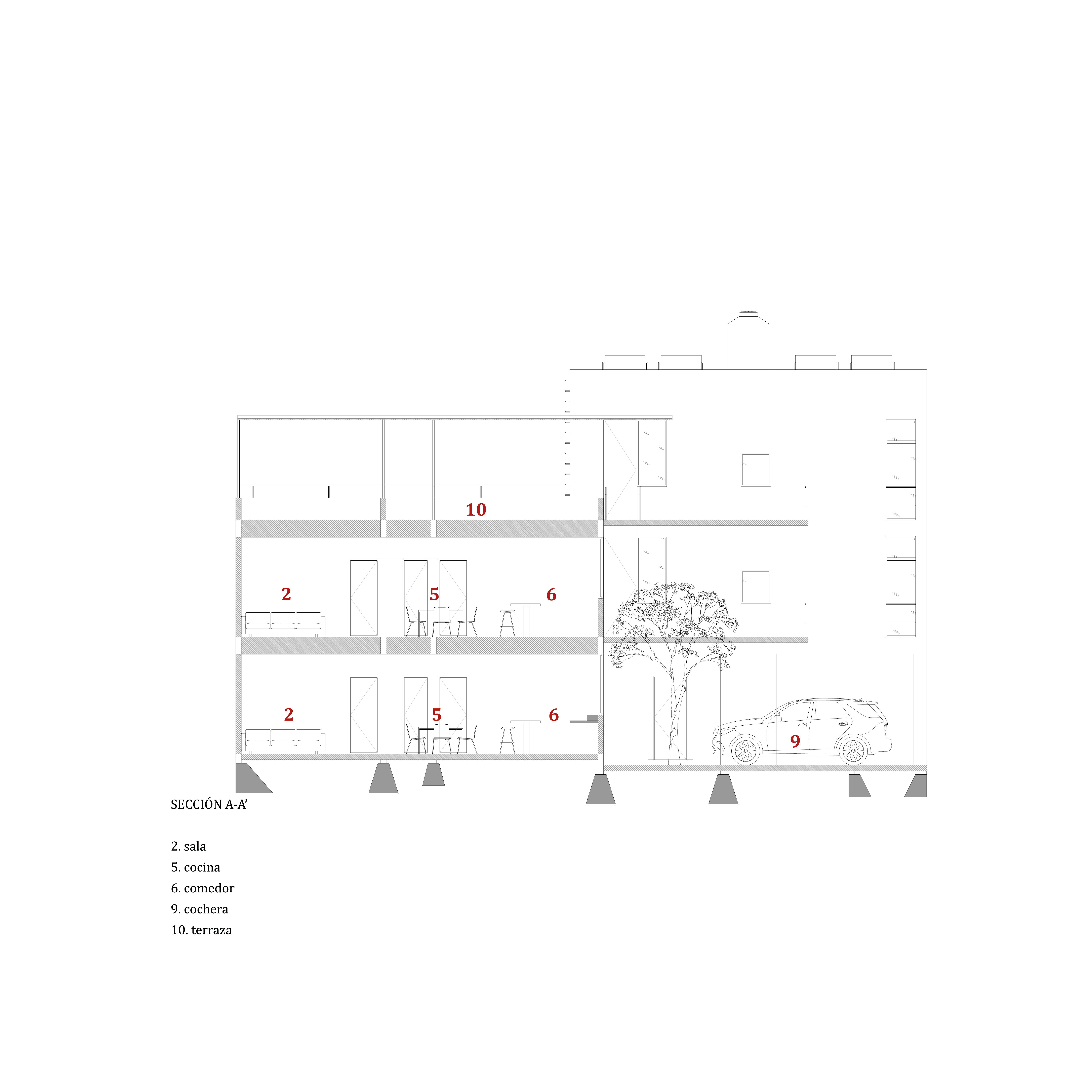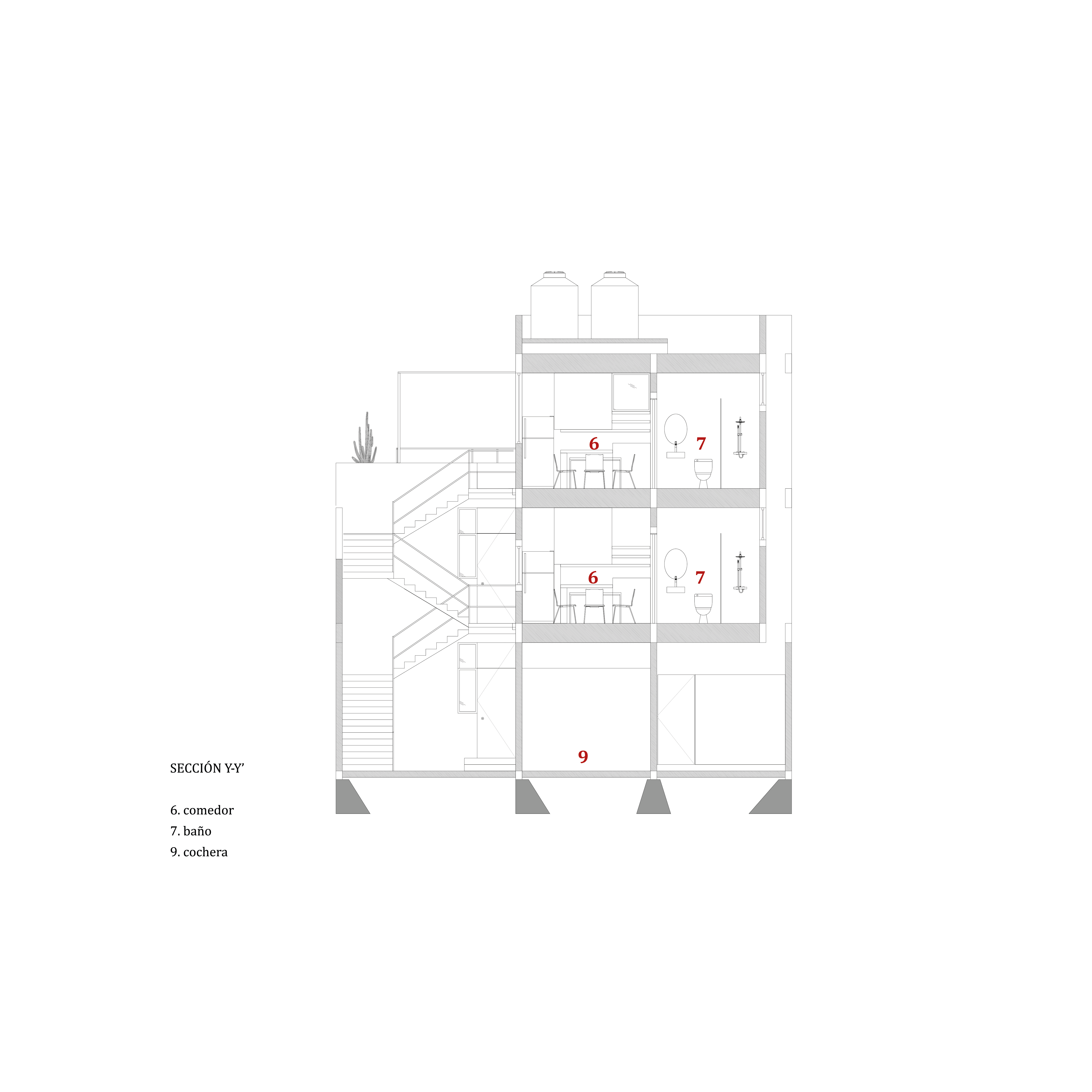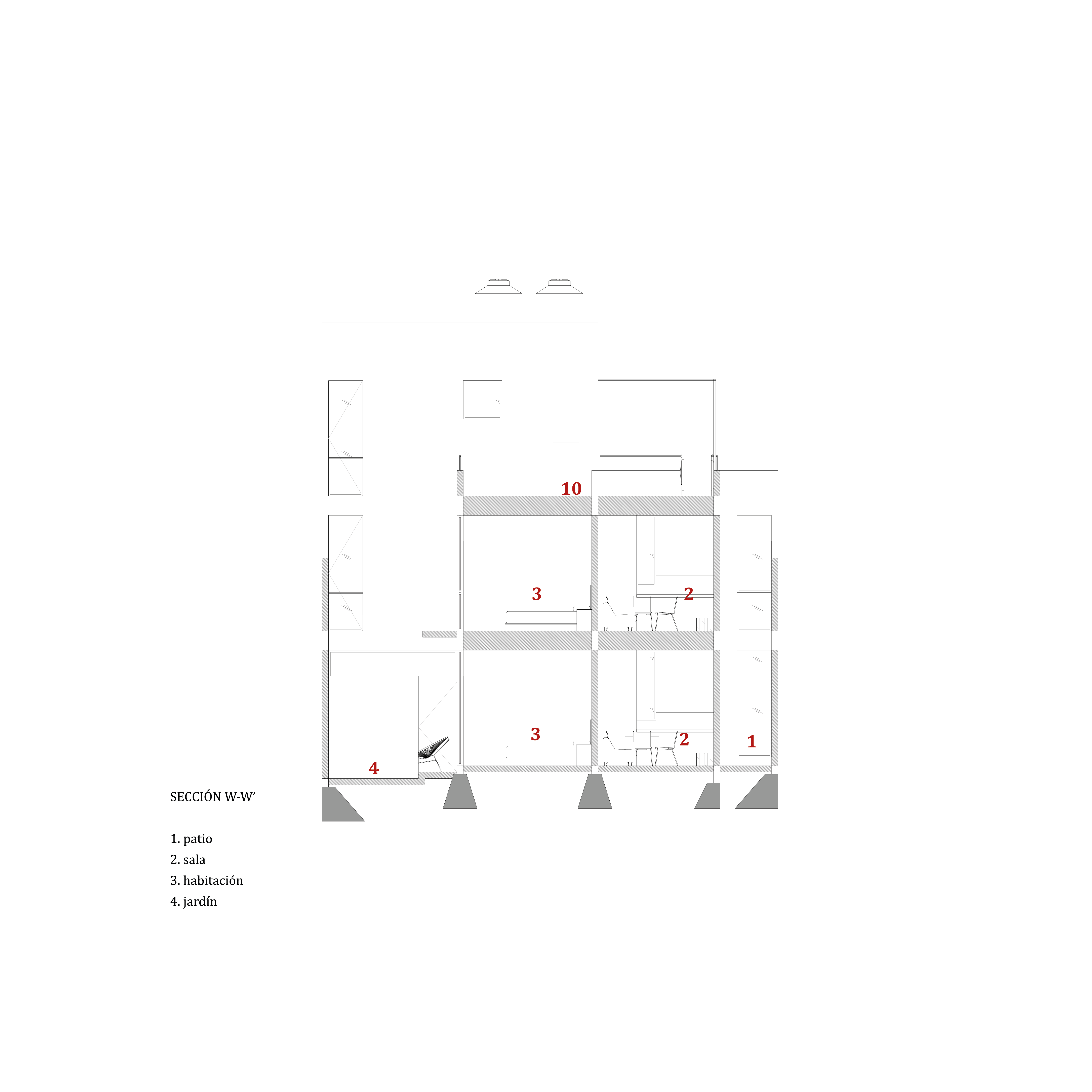 Similar en programa al nivel inferior, pero con el valor agregado de contar con una terraza privada y un patio de lavado y secado, concebido como un espacio compartido para uso flexible entre los habitantes del conjunto.