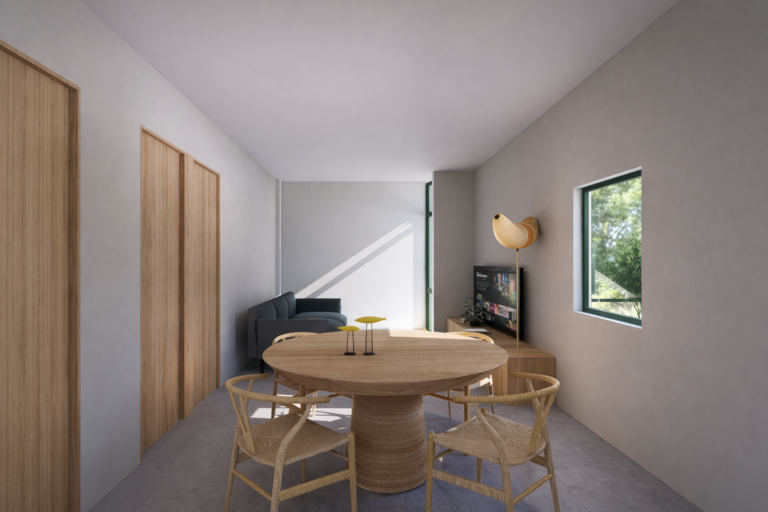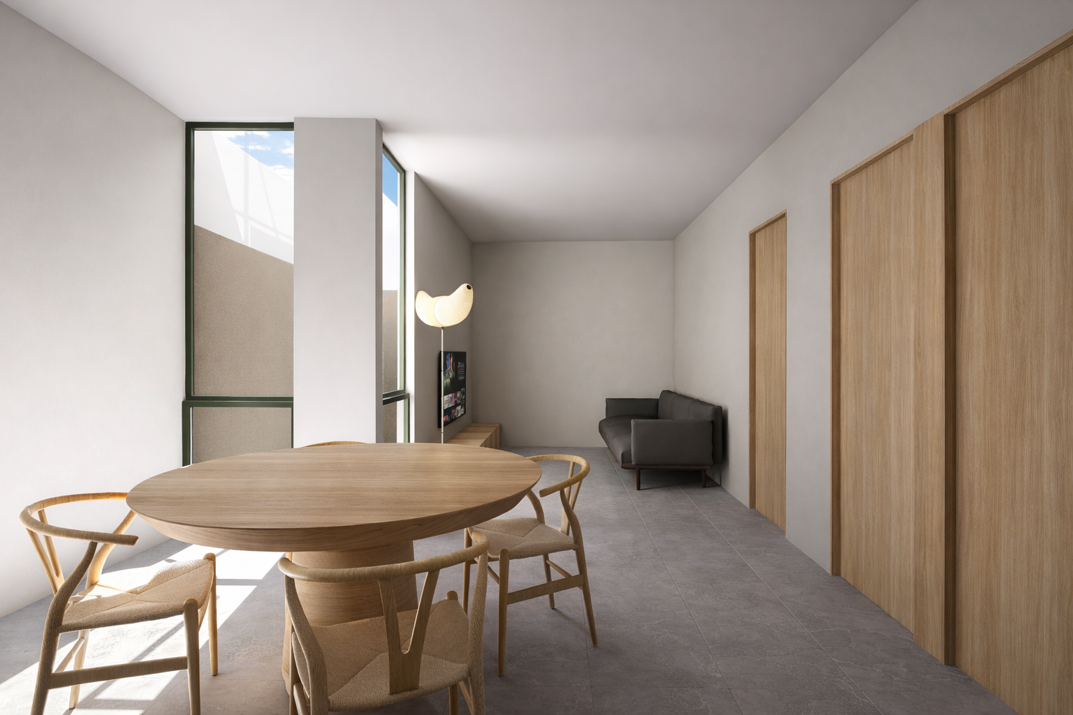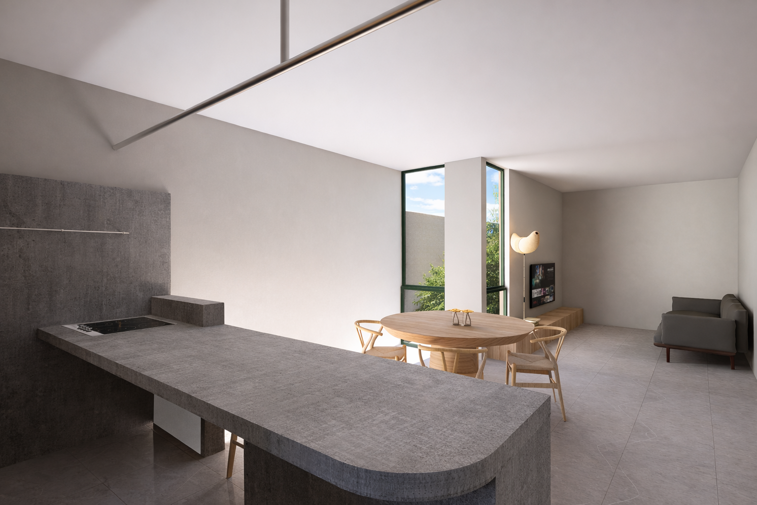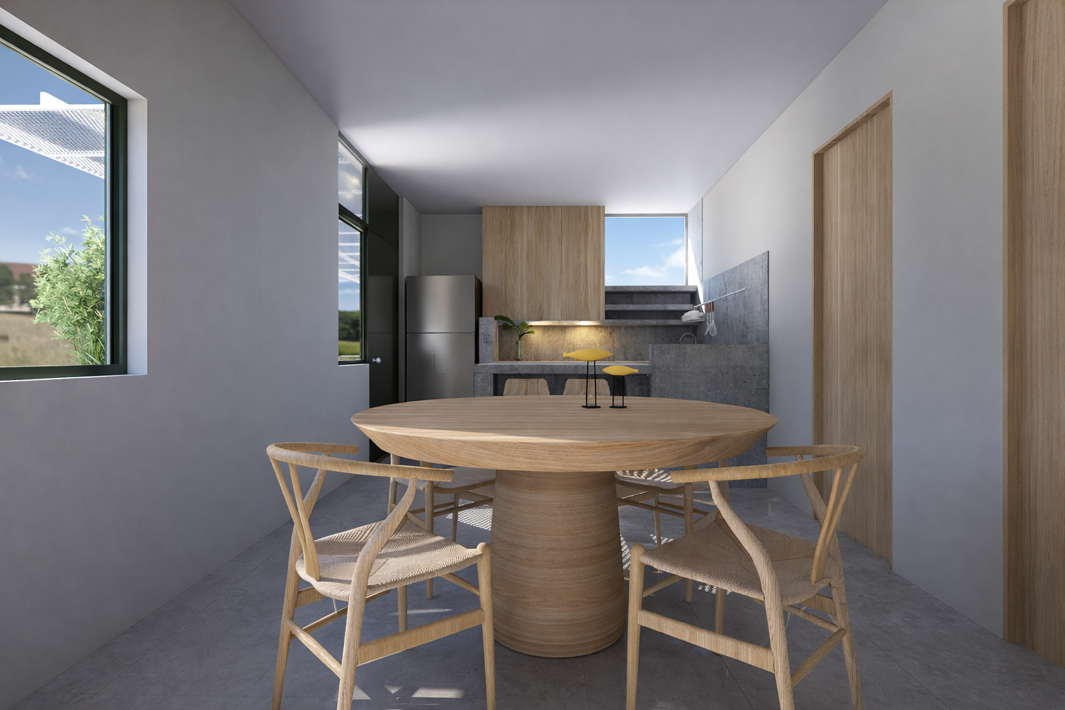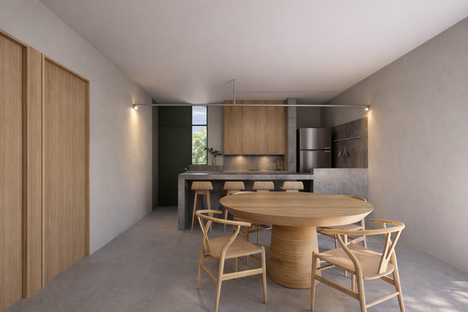 La zona social (sala, comedor y cocina) se desarrolla en una nave continua, ventilada tanto por los patios interiores como por el acceso exterior, generando ambientes frescos y luminosos.