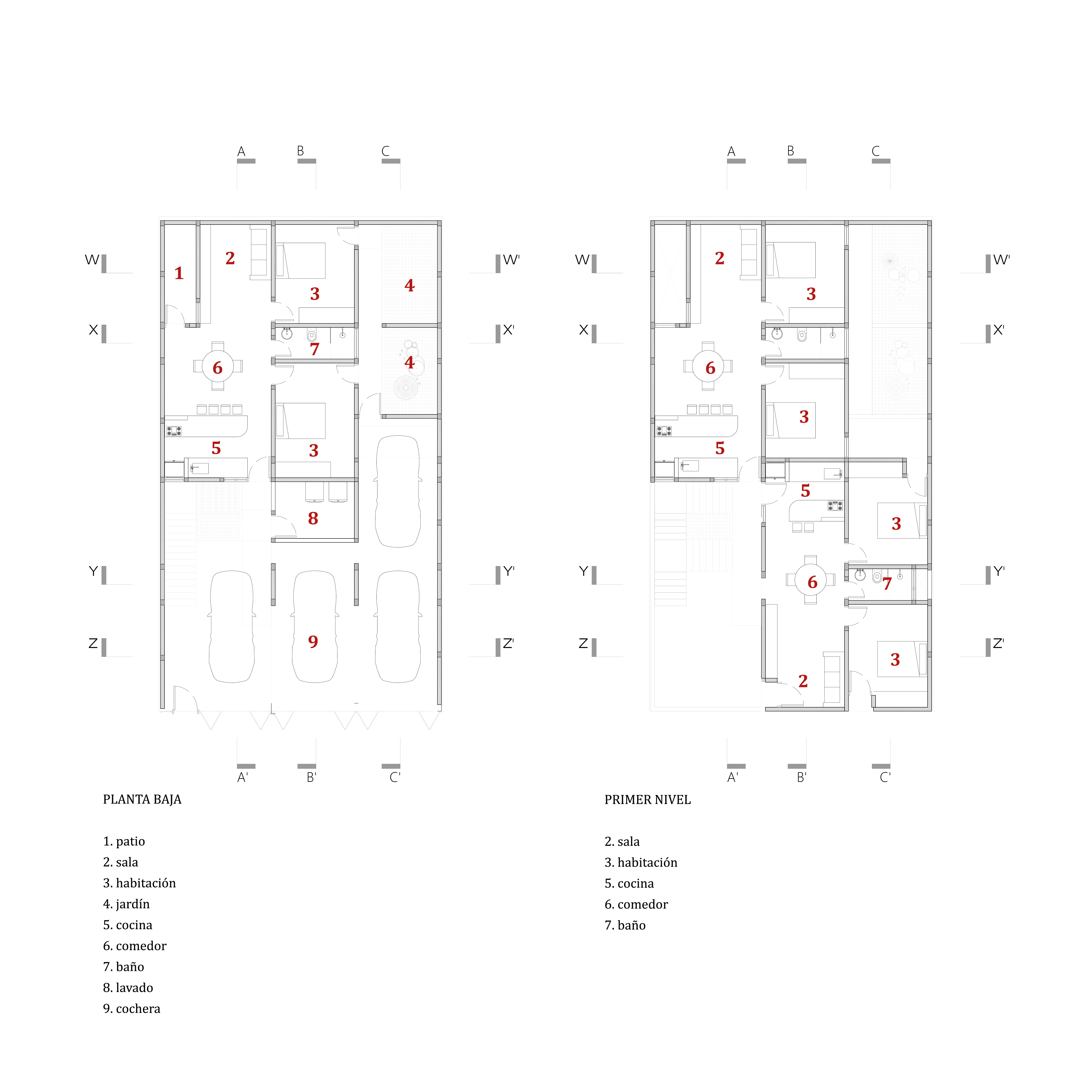 Conservan el mismo programa arquitectónico que el de planta baja, pero sustituyen los patios por balcones que se asoman a los vacíos de luz, generados por los patios del nivel inferior.