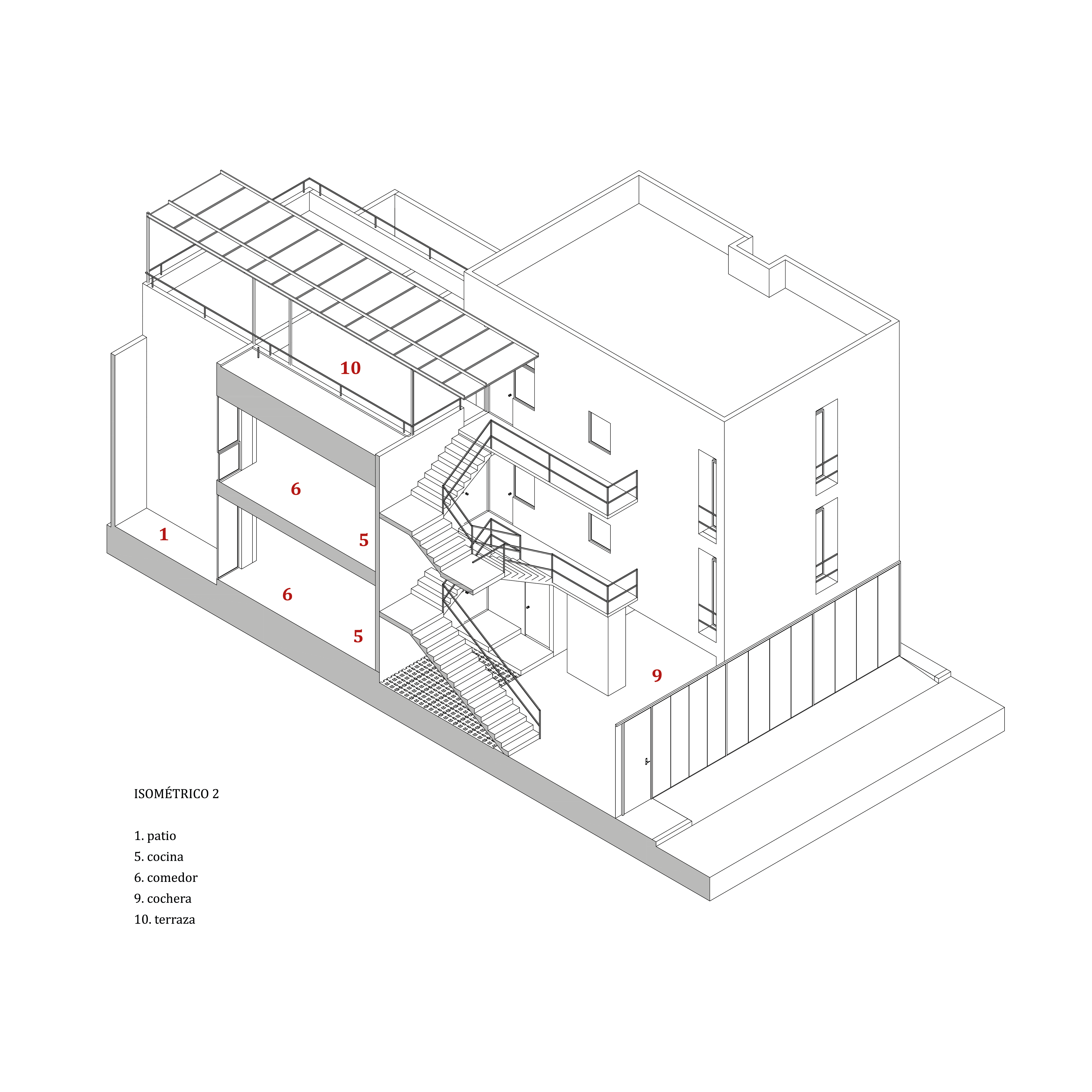 El acceso a cada unidad se realiza a través de una circulación vertical conformada por escaleras de acero expuesto que conectan a un pasillo distribuidor. Esta conexión mantiene un vínculo visual y espacial con el patio central, reforzando la idea de vida comunitaria, e integrándose naturalmente a la fachada, cuya composición permite leer desde el exterior la organización interna del conjunto.