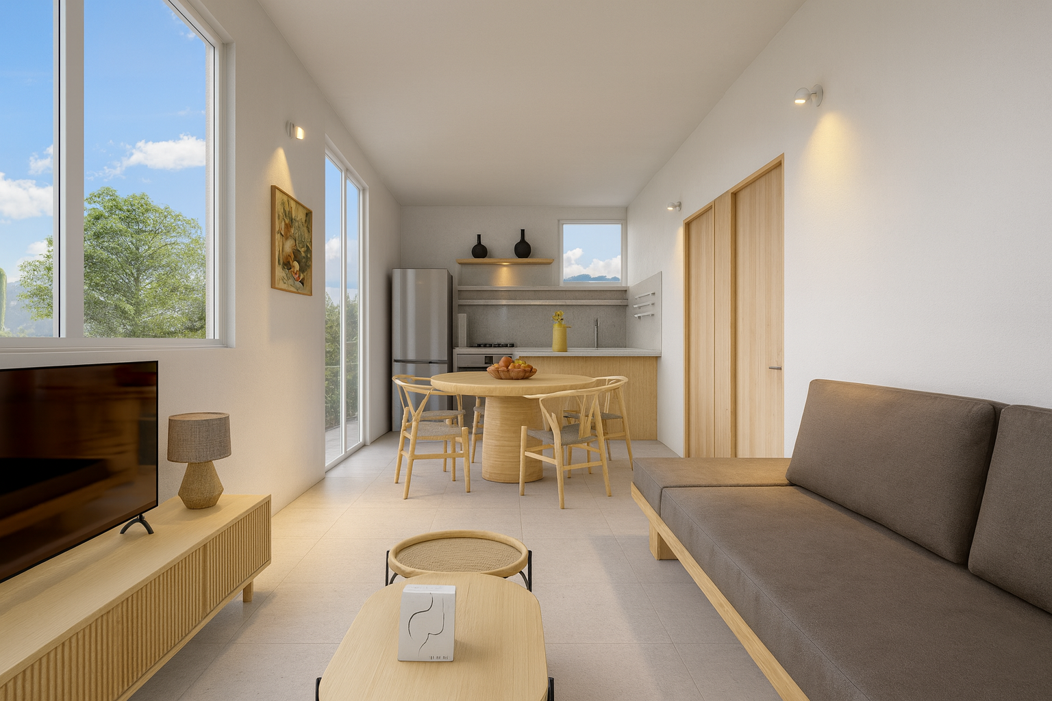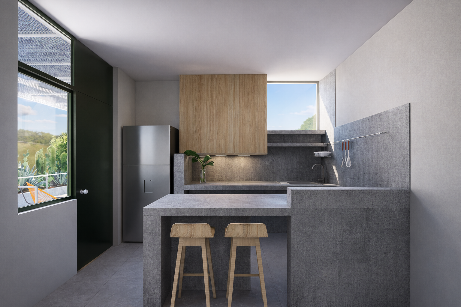 Este departamento destaca por su configuración introspectiva. Se articula en torno a tres patios interiores privados, ubicados en la parte posterior del predio. Estos patios permiten una ventilación cruzada eficiente y una entrada abundante de luz natural, iluminando las dos habitaciones y el baño completo.