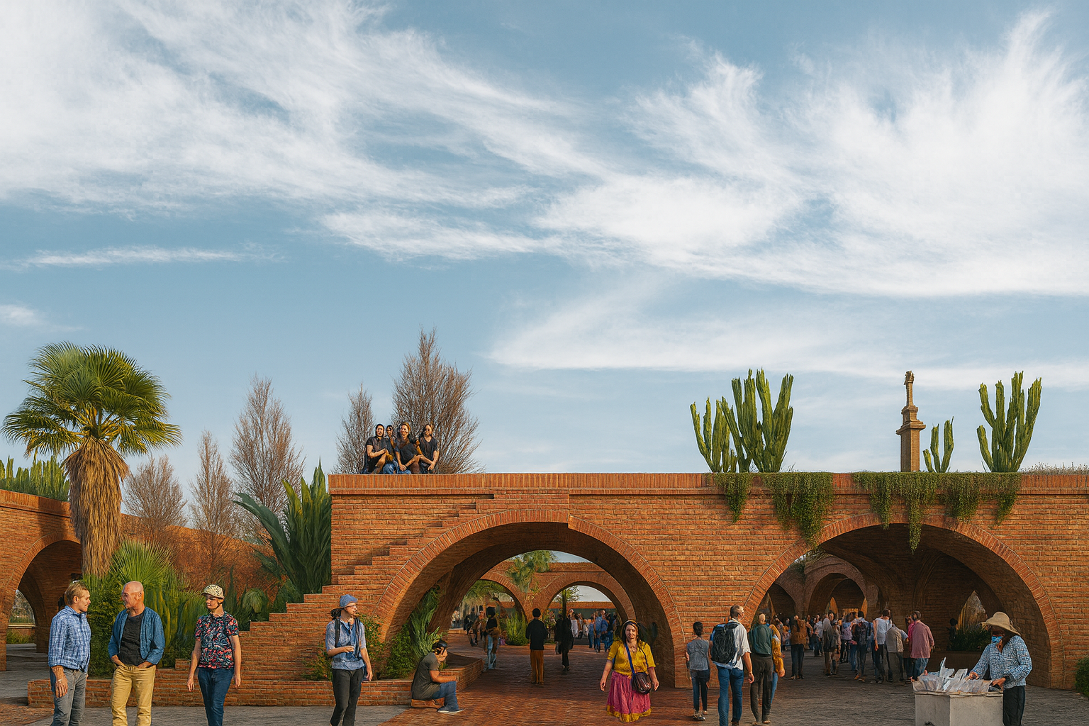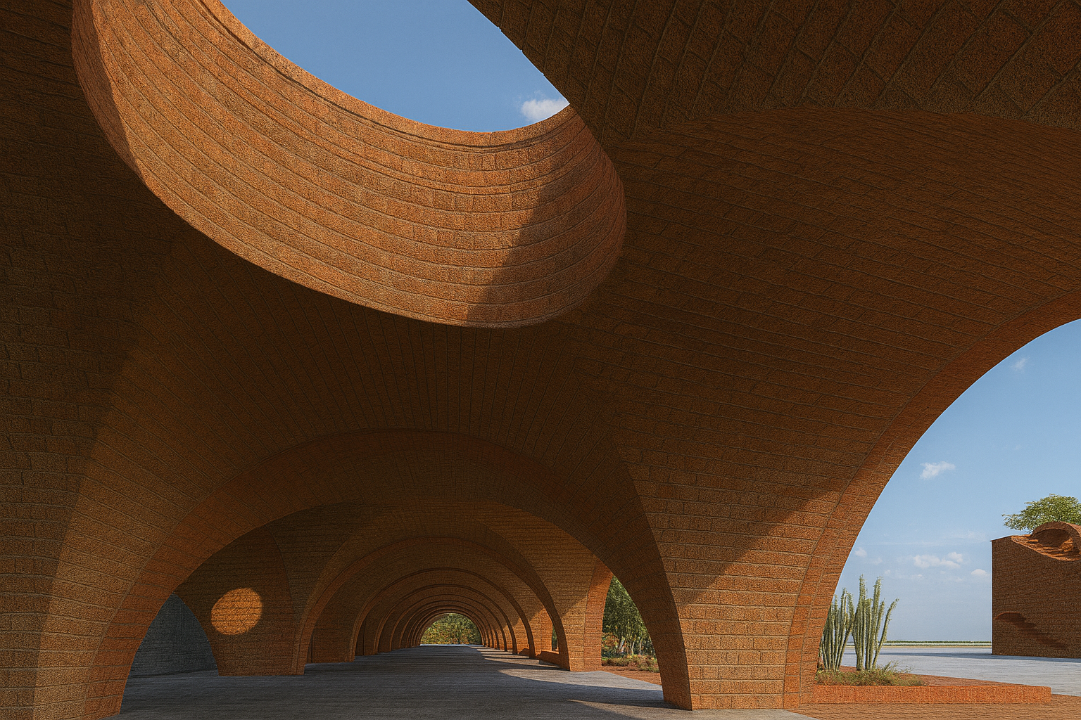 Para potenciar la conectividad y el uso integral del lugar, se propuso la incorporación de un corredor techado y un espacio polivalente, también utilizando los módulos abovedados. Este corredor conecta dos de los puntos más emblemáticos de Tlacolula: la iglesia y el mercado, unificándolos en un eje que promueve el tránsito peatonal y la cohesión comunitaria.