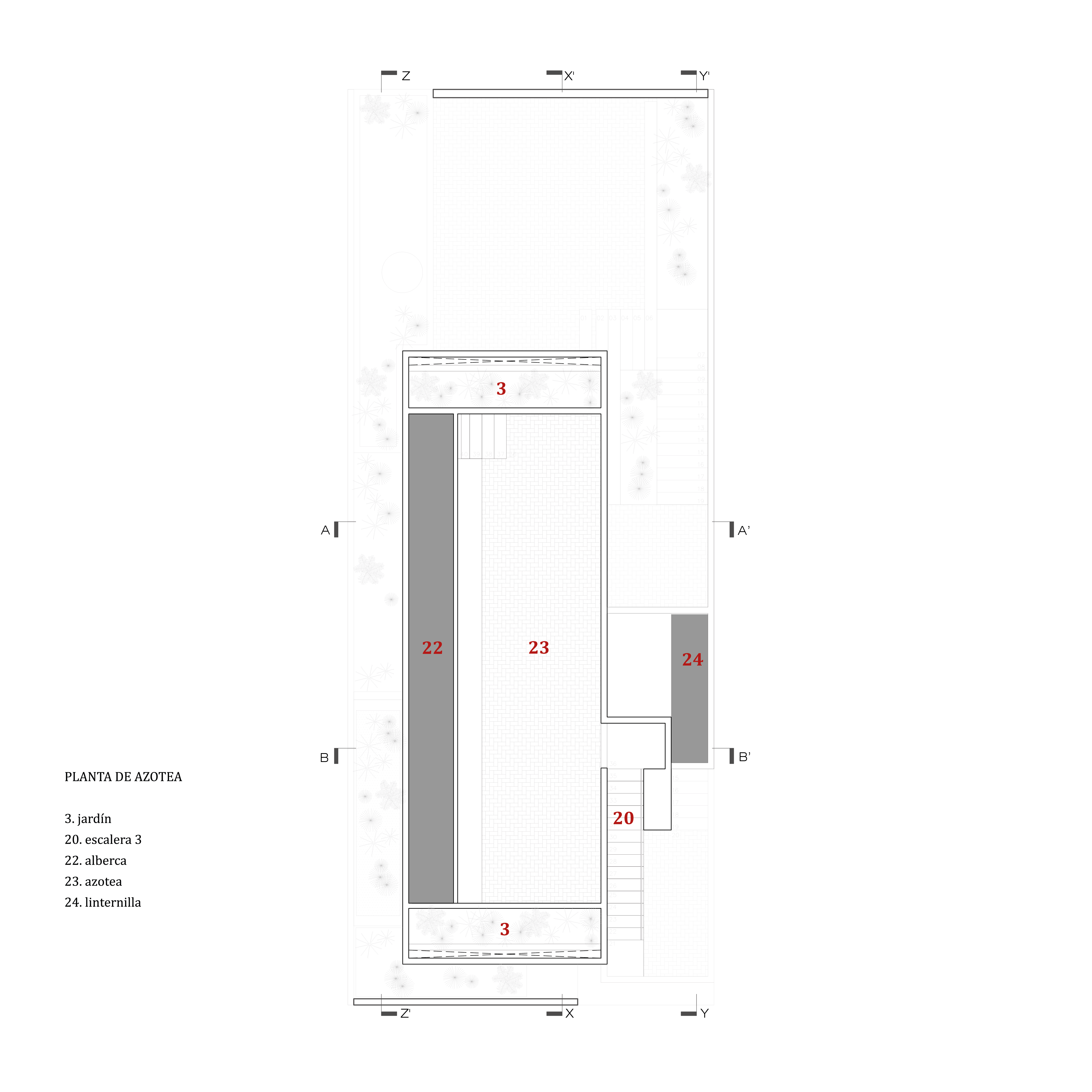 Este nivel se accede por la misma escalera que conduce a la azotea y se concibe como espacio recreativo al aire libre. Alberga una alberca longitudinal de formato estrecho, rodeada por jardines perimetrales que funcionan como barrera visual hacia el exterior. Se complementa con una terraza tipo roof garden, destinada a actividades sociales, generando un espacio de convivencia con vistas controladas.